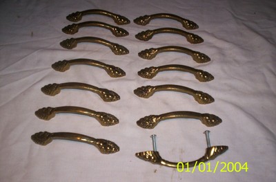 | 8 Vintage style Antiqued Cast Brass Handles Description New Overstock This auction is for 8 vintage style antiqued cast brass door. Drawer handles pulls. Beautiful, detailed large handle. New overstock. Never used condition. Measures 11" long. 3 1/2" wide. Rossette measures 4" long, 2" wide. Please note measurement before purchase. Measurement between screws 5 1/2" All have a standard 1" hardware screw included for attachment at no charge. If the screw doesn't meet your application. You will need to supply your own. This is an overstock from a prominent North Carolina Furniture Manufacture. If you need a different number of handles than listed. Please contact me. I will be happy to change the listing to the number you need. I have recently acquired the contents of a warehouse which has been setting for several ... more years. I have found numerous boxes of cabinet and furniture hardware. Decorative items and several different sizes of hinges. I am listing several lots of hardware this week. Check them all out. May be just what you are looking for. I have a cherry bedroom suite which has 44 handles and 7 escutcheons or key hole covers. It is hard to find that many matching. I am glad to quote a BUY IT NOW price on additional handles of this style. Any questions. Don't hesitate, I answer all emails. I am always happy to combine shipping for multiple purchases. Please click on VIEW SELLER'S OTHER ITEMS To see all of my listings. Thanks for looking. Payment Thank you for shopping with me. I accept pay pal. Payment should be received within 7 days after close of auction. I only accept pay pal from international buyers. I am glad to ship to International buyers. But I cannot be responsible for items after they leave the USA. I sincerely appreciate your business! Laverna Terms of Sale Returns accepted ONLY if I have grossly misrepresented the item. If you have a problem. Please contact me immediately upon receipt of item. Item needs to be in my hands within 10 days after I have been cont |
