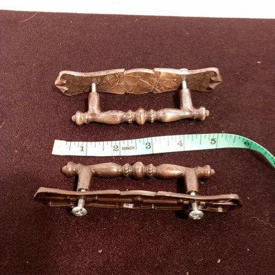 | have some antique unique drawer pulls. or dresser knobs. All matching, all a set. sellling together each is about 7"Long, set of 6. pleease see actual photos for details. thanks Check out my! Approx holes 5 1/2" apart. |